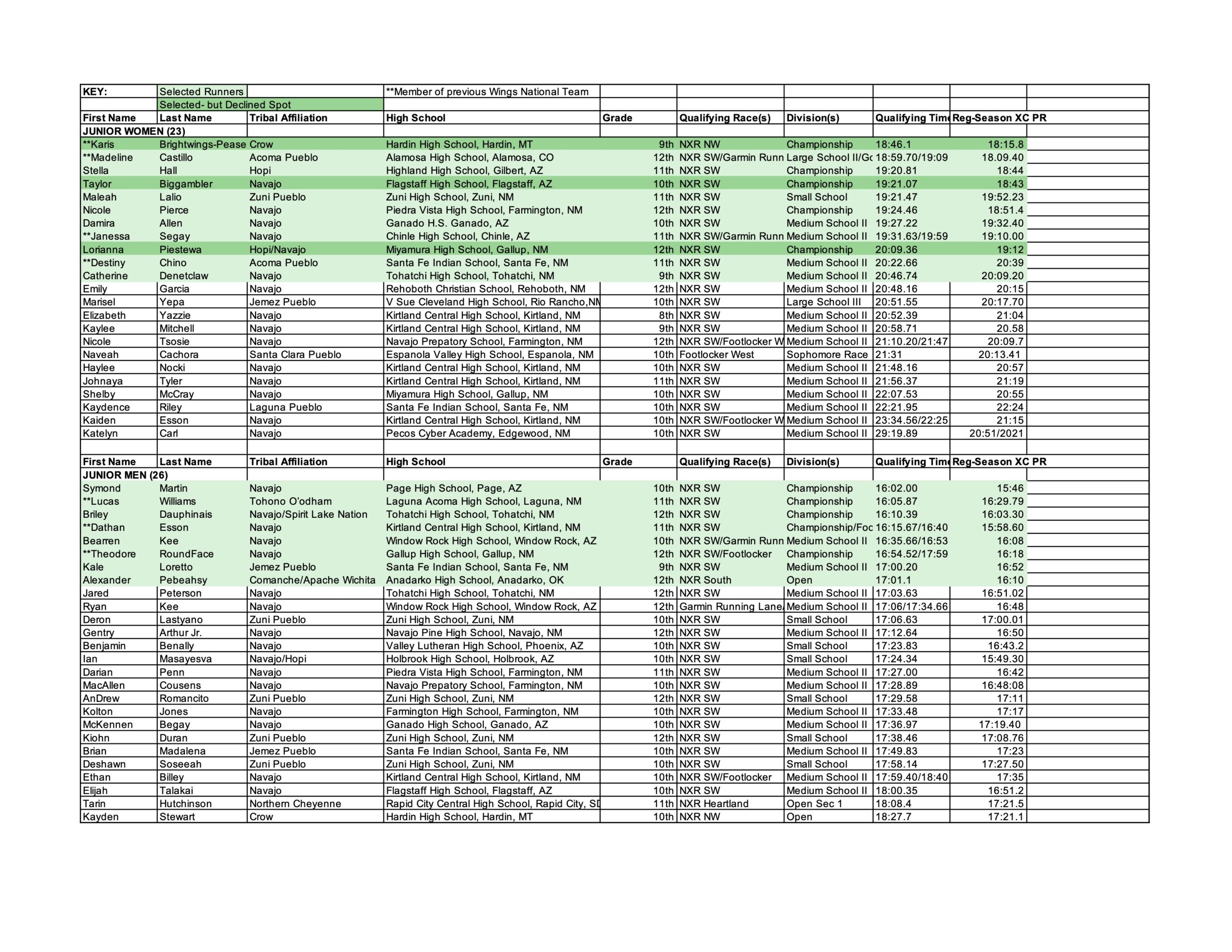 Name/Grade | Tribal Affiliation(s) | Seed Time(s) | Qualifying Race(s) | School/Town |