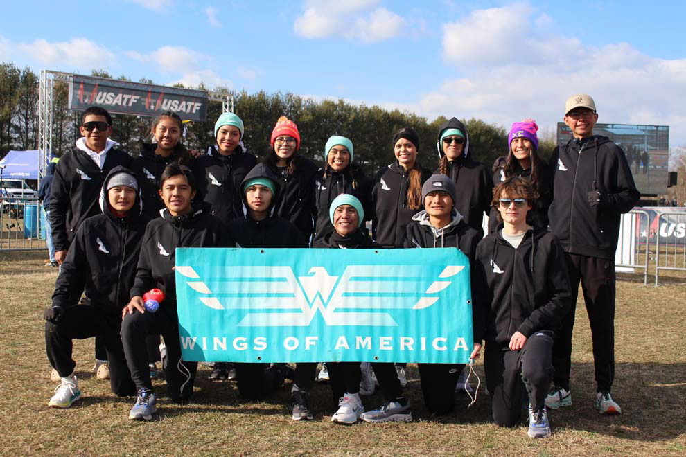 For the 35th time since 1988, Wings of America sponsored a team of the fastest Native American runners ages 14-19 to compete at the USA Cross Country Championships. Eight young men and eight young women represented the organization in the “junior” age division races on January 20, 2024 in Richmond, VA at Pole Green Park. They embraced the unique opportunity to race the NCAA regular-season cross country distance (Women 6KM, Men 8KM), as well as line up with numerous college freshman.